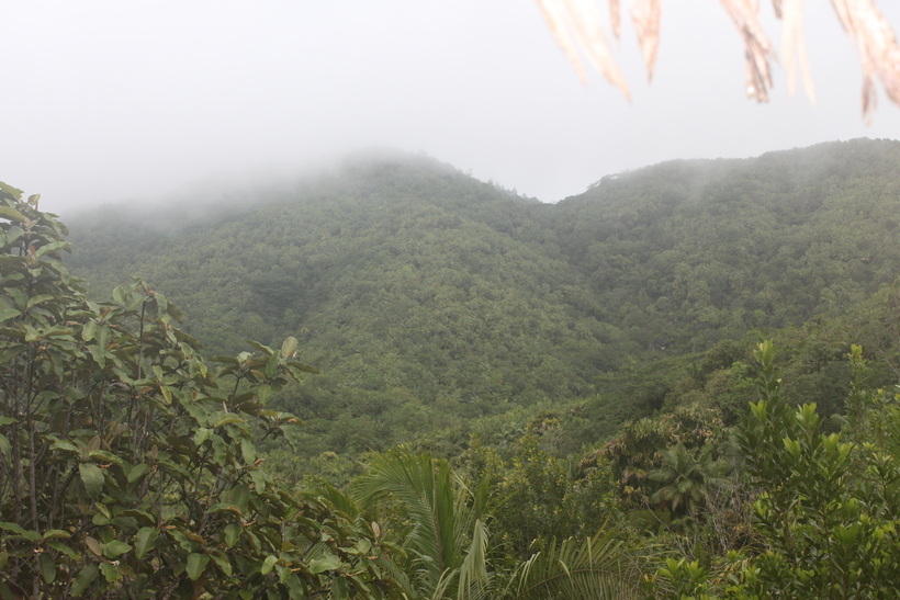 Во время экскурсии гид рассказывает о истории и особенностях выращивания пальмы Коко дэ Мэр. А какие они огромные… Широкие листья пальм перекрещиваются над головой так, что под ними практически нет солнечного света, и почти ничего не растет. Находясь в этих джунглях из толстенных стеблей, чувствуешь себя крайне необычно – ходишь по голой земле под листьями и ощущаешь себя как жучок в траве. Только посмотрите, какие плотные заросли остались позади!