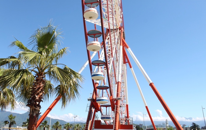 Всем нам с детства известен этот увлекательный аттракцион. Он же есть и в Батуми. Скажу честно, колесо обозрения - идеальная смотровая площадка. Билет мне обошелся всего лишь в 3 лари (это 1 евро). С высоты открывается вид на Батуми, прибрежье и горы, особенно он прекрасен во время захода солнца. Кабинки колеса никак не застеклены, они открытые. Аттракцион открыт с 10.00 утра до 1.00 ночи.