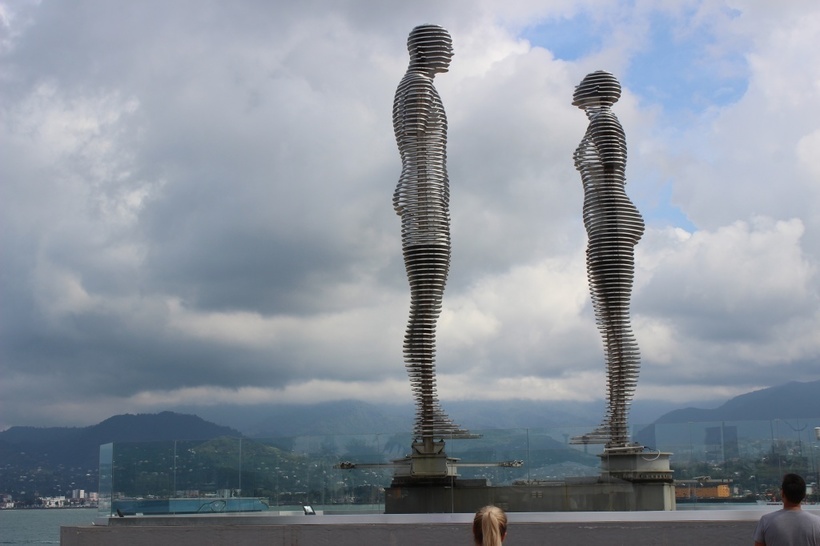 Это 8-метровое произведение искусства выполнено в современном стиле по мотивам романа. Скульптуры мужчины по имени Али и женщины Нино движутся навстречу друг другу, после чего проходят сквозь друг друга не соприкасаясь и оказываются повернутыми друг к другу спиной, после чего снова возобновляют движение навстречу. Весь этот цикл по продолжительности занимает где-то 10 минут. В скульптуре имеется любовный смысл, который , как мне кажется, заключается в том, что иногда слишком большая близость двух партнеров может стать помехой тому, чтобы слышать и видеть друг друга. В результате этого возникает недопонимание и люди отдаляются друг от друга...
