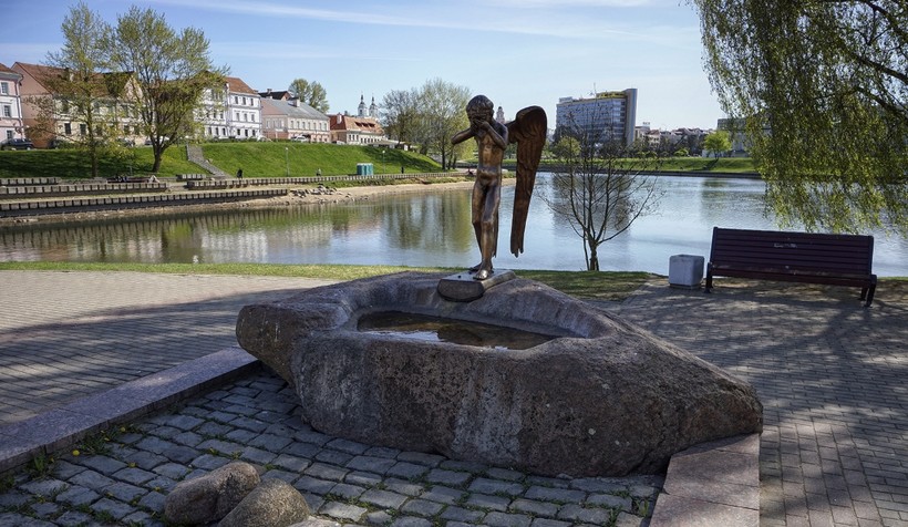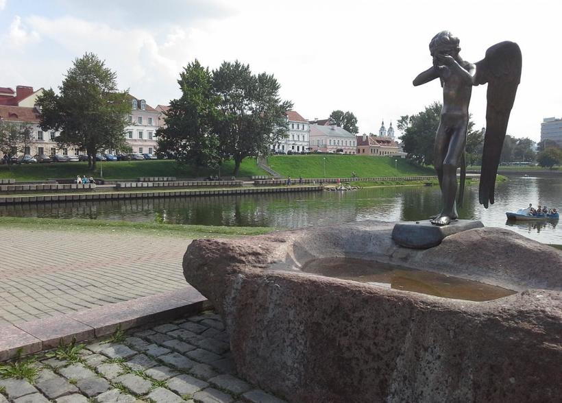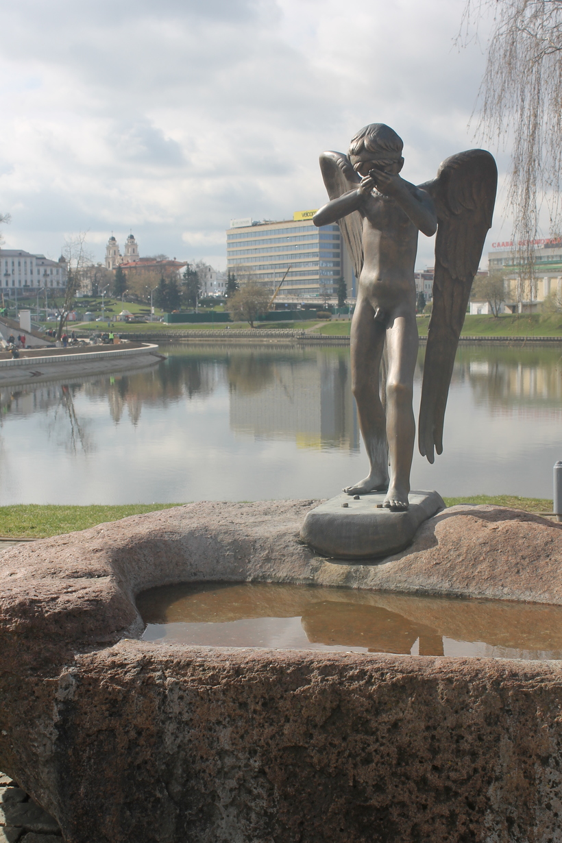 Добравшись до Троицкого предместья и пройдя небольшим горбатым мостом через Немигу (приток Свислочи), оказываюсь на Востраўве Мужнасці і Смутку, то есть «Острове Мужества и Скорби». Второе имя этот искусственный островок получил в честь скульптуры плачущего ангела, что стоит на краешке каменной чаши.