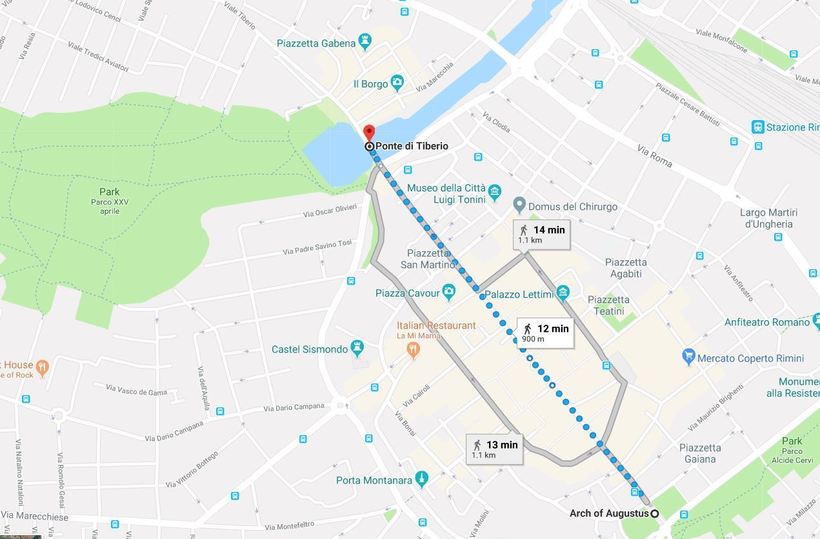 Добраться до моста можно пешком, двигаясь по прямой от Арки Августа по улице Corso d'Augusto. Путь займет около 12 минут.