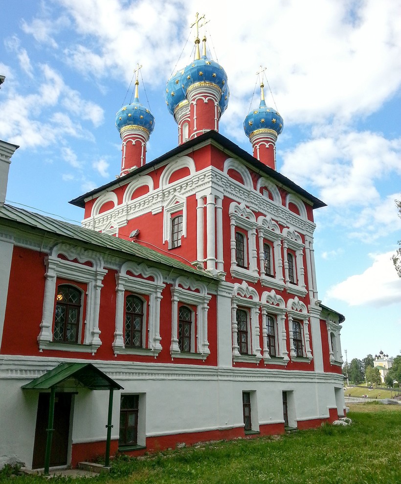По форме церковь состоит из трапезной, колокольни и собственно церкви – такая структура очень распространённая и называется «кораблик». Действительно, получается такая конструкция движущаяся, не тяжёлая, лёгкая. В общем, церковь красивая, особо печальных и страшных мыслей не навевает. Стоит она в Углическом кремле, и там же рядом княжеские или боярские палаты – один из немногих сохранившихся светских памятников. Обычно сохранялись каменные церкви, а все жилые помещения, деревянные, уничтожались. А тут вот эти палаты сохранились, единственное что – они стали ниже, потому что культурный слой земли нарос и поглотил первый этаж.