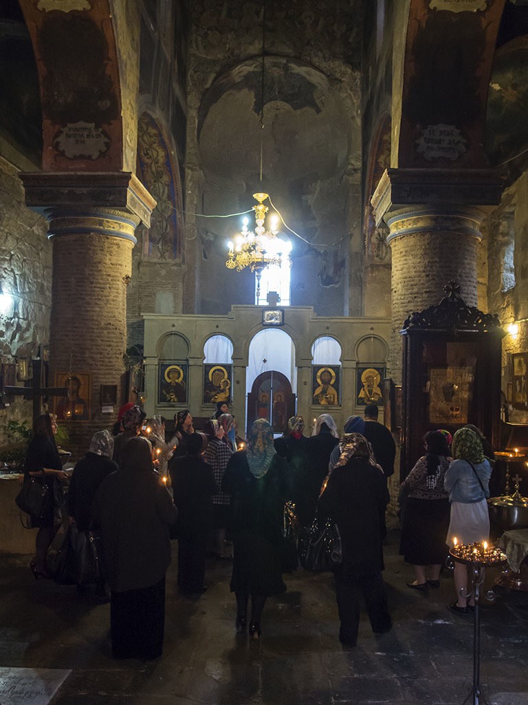 А вот дальше я советую просто отключить все свои какие-то знания, которые вы почерпнули из путеводителя, и попробовать ощутить истинный дух этого места. Если под ярким грузинским солнцем церковь с внешней стороны похожа на кучу других грузинских церквей, особенно если вы здесь не в первый раз и уже кое-что повидали, то когда вы заходите внутрь, понимаете, что это место кардинально отличается от других. Оно довольно тёмное, но при этом нет гнетущего ощущения – вот это странность, потому что церковь каменная, старая, у неё очень толстые стены, она больше напоминает крепость, чем религиозное сооружение. Но, впрочем, в тёмные века церкви строили именно так, потому что всегда находились какие-нибудь охотники пограбить монахов. Это наследие – оно ощущается. Ты заходишь и словно проваливаешься в этот самый IV век, хотя вокруг тебя люди в современной одежде, всё равно сильно ощущение, будто сработала машина времени, и современный мир провалился в небытие, а ты вот здесь в совершенно ином и немного чуждом тебе окружении.