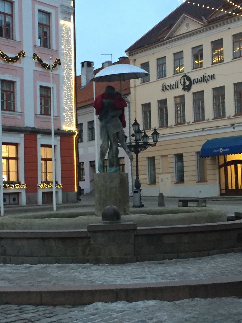 Сразу перед зданием Ратуши расположился очень романтичный фонтан - Целующиеся студенты, ставший символом города. Скульптор создал этот фонтан на основании фотографии племянника и его девушки. Они гуляли под дождем и застыли в поцелуе под уютным зонтом, именно такой фонтан и стоит на Ратушной площади в Тарту. На этой площади назначают свидания, деловые встречи, проходят праздники, организуют свадьбы. Это центр культурной и общественной жизни города.