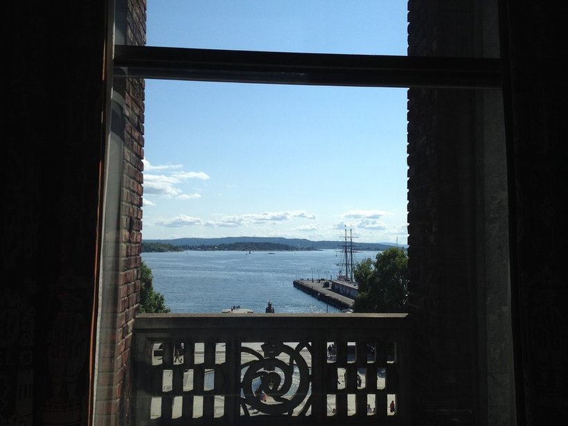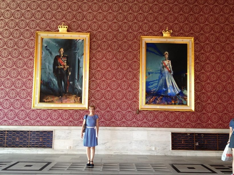 Вид, открывающийся из окон второго этажа на Осло-фьорд чудесный. В банкетном зале опять проснулось ощущение сказочного дворца. Такой интерьер не мог не пробудить во мне желания покружиться в вальсе, но с этим пришлось справиться. И сделать серьезное лицо, созерцая портреты короля Харальда V и королевы Сони.