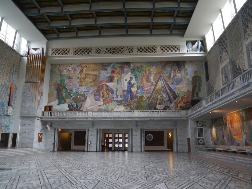 Внутри Галереи было прохладно и свежо, как и положено зданию с такими стенами. Не во все помещения можно попасть без экскурсии. Поэтому мы увидели не очень много комнат. Но от увиденного впечатлений хватило. Вторую половину дня мы провели в галерее ратуши. Только лишь оказавшись внутри, я сразу почувствовала себя маленькой. Огромный зал, который визуально еще увеличивался, благодаря свету, скользящему по поверхности. Именно здесь происходит церемония вручения премии мира.В центре-огромная картина, изобращающая жизнь Норвегии. Картин такого характера, воспевающего труд простого человека, очень много в этой галерее.В этой зале они расположены по всему периметру, но первоначально мое внимание привлекла именно центральная картина. На второй этаж мы поднимались по лестнице, забывая смотреть под ноги, так как эта картина, а также те, что тянулись через всю стену, продолжая тему истории народа в этом королевстве, все время приковывали мой взгляд. К слову сказать, сама лестница тоже стоит особого упоминания. Очень торжественная, официальная, она не случайно именно такого величественного вида-по ней спускается нобелевский лауреат для церемонии награждения.