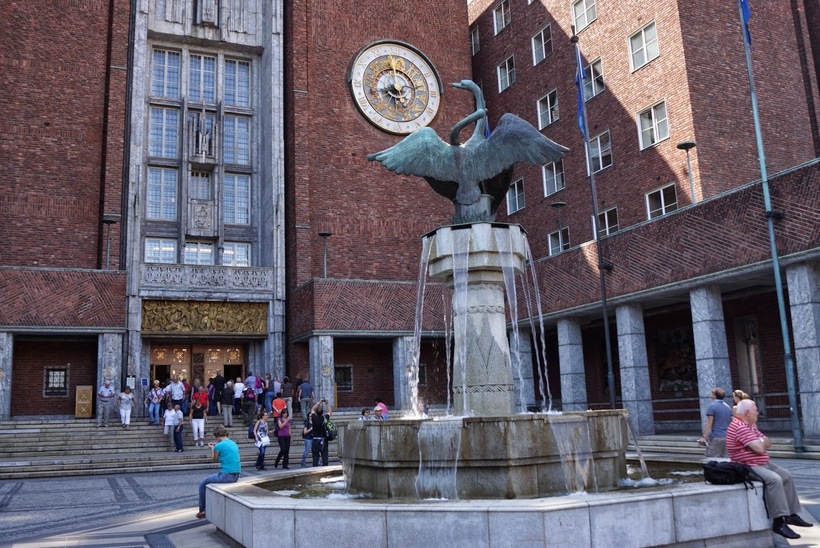 Ратушу видно со всех сторон набережной. Массивное сооружение, сразу навеяло бы на меня мысли о позднем средневековье, но вмешались огромные часы, украшающие ее башню. Впрочем, с ассоциацией со средним веками вполне справилась стоящая недалеко крепость. Знающие люди просветили меня, что это ратуша. Вход в ее галерею находится не со стороны моря, а со стороны города. Вместе с мужем мы отправились туда. Пришли мы, видимо, рано, но уже после 14 часов. Пока ожидали, смогли рассмотреть многочисленными сюжетами из скандинавской мифологии. Содержание передается в виде композиций, вырезанных из дерева. В центре двора стоит фонтан, который пользуется особой популярностью жарким летом.
