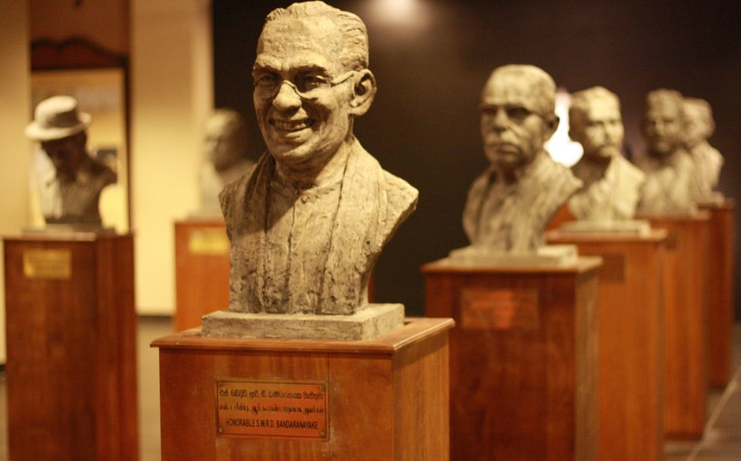 По центру зала стоят бюсты известных деятелей. В том числе и Соломона Бандаранайке, который на заре становления независимости страны, основал Партию свободы Шри-Ланки (1956 год). По сути это были сингальские националисты, выражавшие интересы буддийского большинства. Этот факт мне до сих пор тяжело переварить, ведь в нашем понимании “национализм” – это плохо. А "буддизм" – хорошо. В галерее есть и бюст его жены Сиримаво Бандаранайке, которая возглавила страну после убийства мужа. Кстати, именно она – первая женщина премьер-министр в мире. На время её правления приходится демократизация и экономический рост благосостояния страны.