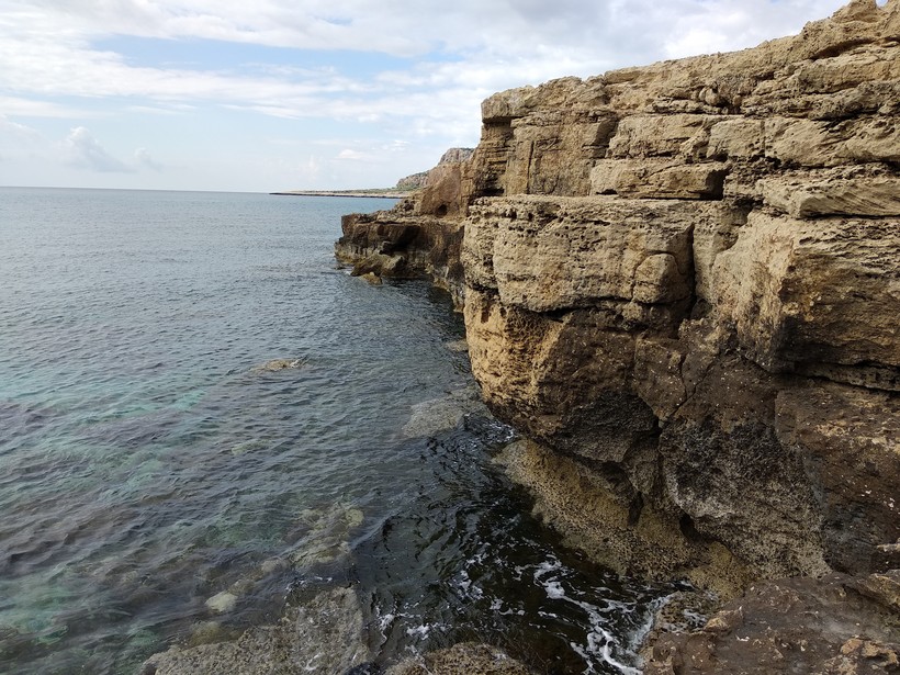 Но спуститься к воде в преддверии мыса можно. Здесь – традиционные кипрские скалы из ракушечника и прохладные воды Средиземного моря.
