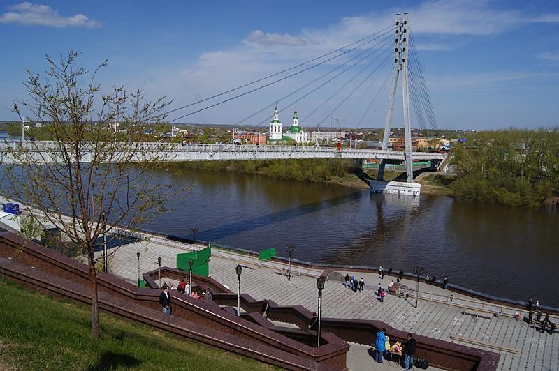 Конечно, дать четких координат я не смогу, ведь это целый мост, он связывает берега реки Тура. Но в целом, сориентировать могу - начало моста находится на пересечении улиц Ленина и Республики. На самом деле, рекомендую вам взять такси, если вы собираетесь целенаправленно отправиться к мосту, уверяю вас, избежите ненужных трудностей. Я же добралась до моста, неспешно прогуливаясь по городской набережной.