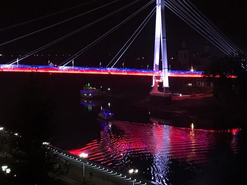 Я, ничего не подозревая, зашла на мост (кстати, подъем на него достаточно крутой, наверняка, очень неудобно забираться на колясках или инвалидам), хожу такая, любуюсь рекой. И вдруг резко вспыхивает подсветка. Я о ее наличии не знала, и это было для меня неожиданно. С подсветкой мост выглядит очень интересно, даже я юы сказала, необыкновенно-волшебно. Еще лучше подсвеченный мост выглядит издалека, с набережной, эффектно и ярко.