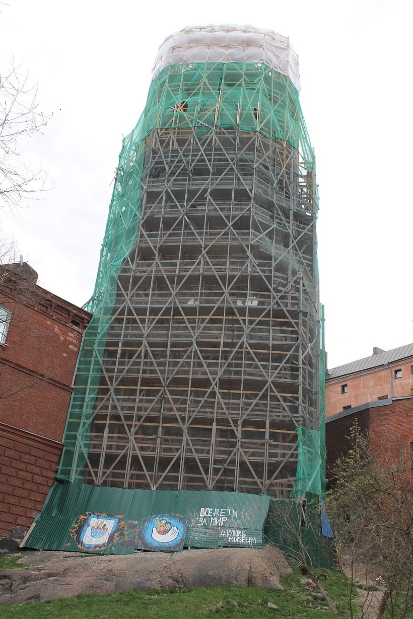 Еще несколько лет назад, на самом верху башни располагалась смотровая площадка, откуда можно было изучить окрестности Выборга, аллеи парка Монрепо и даже увидеть кусочек Финляндии. Сейчас, понятное дело, доступ на смотровую закрыт. Поэтому не знаю, насколько правильным будет решение увидеть башню, я как не пыталась, под пыльными полотнами и пленками сооружение разглядеть не смогла.