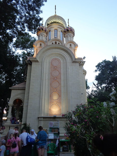 В заключение мы прошлись по той части парка, которая посвящена Средневековью, посидели в беседке-ротонде, прошли по изогнутому мостику над водоемом и поднялись на дозорную башню с винтовой лестницей, оттуда парк виден как на ладони. Недалеко от этого места находится католический храм. Вероятно, в более раннее время он открыт, но мы были уже ближе к вечеру, поэтому внутрь попасть не удалось.