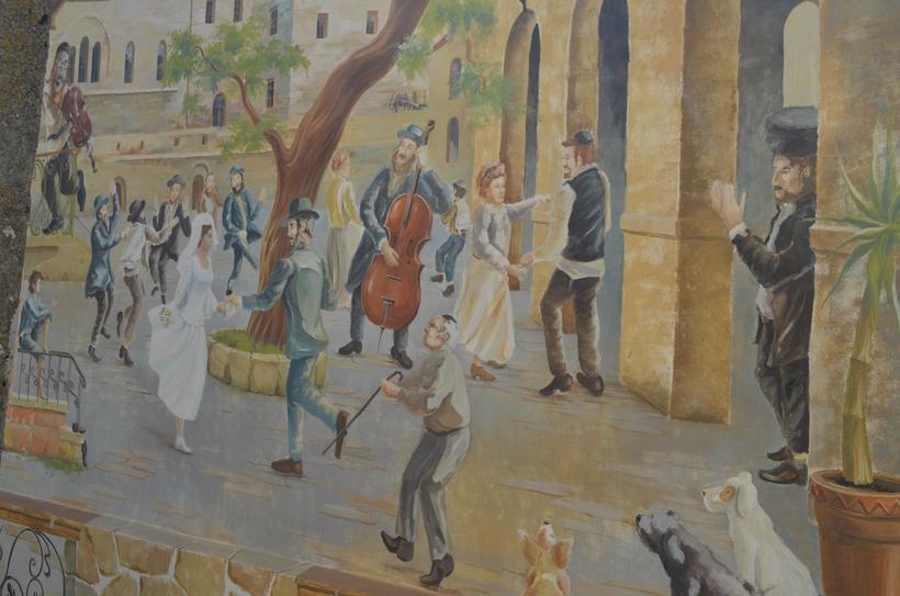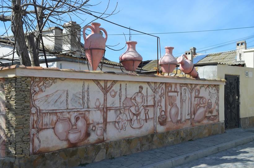 Что делать. Для начала проникнуться атмосферой места. Караимская улица, в конце которой находится комплекс кенас, с обоих сторон обставлена отреставрированными и стилизованными под старину домами. Порой кажется, что ты попал в прошлое, причём не в то убогое и грязное, что было в действительности, а в прилизанное. Впечатление усугубляет мощеная мостовая, на которой запросто можно подвернуть стопу, если слишком долго таращиться на дома и настенные росписи. Последние нам встречались не раз и всегда мы возле них останавливались, чтобы оценить очередную сцену из местной жизни.