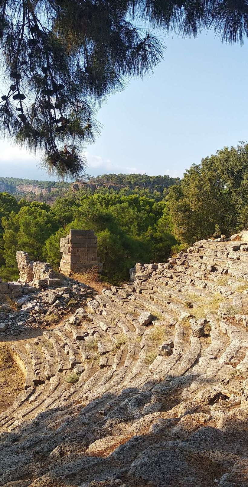 Если водитель скажет ок, вы выбрали правильный вид транспорта. Ехать минут 30. Стоимость билета 6 лир, 1,5 доллара/евро. Последняя маршрутка назад в 18.30 (по факту нужно быть хотя бы в 18.20 на месте и выйти из самого города не позже 18.00). Выходя из маршрутки уточнила в водителя: «Когда последний автобус назад?» «В 10 вечера!» Еще подумала, что что-то подозрительно как-то. Переспрашиваю у мальчика, который продает билеты для входа, тот сказал, что в 18.30. Водитель, получается, имел ввиду просто свой последний рейс без заезда в Фазелис и могла бы я среди ночи ловить какой-то транспорт на трассе или такси. :) Стоимость входного билета – 36 лир. Доллары, евро не принимают. Самый адекватный способ размена в Кемере – зайти супермаркеты Мигорс или Шок и купить что-то за евро или доллары, сдачу вам дадут в лирах. Возле остановки сразу стоит задние, где можно уточнить инфу и купить билеты. Сотрудники худо-бедно общаются по-русски. Дальше проложена дорога через лес и небольшой пригорок которая и приведет к античному городу и пляжам. Зимой 2019 в этом месте прошло торнадо, которое здорово потрепало местные деревья, идешь такой, а там везде сломанные ветки, выдранные с корнем деревья.