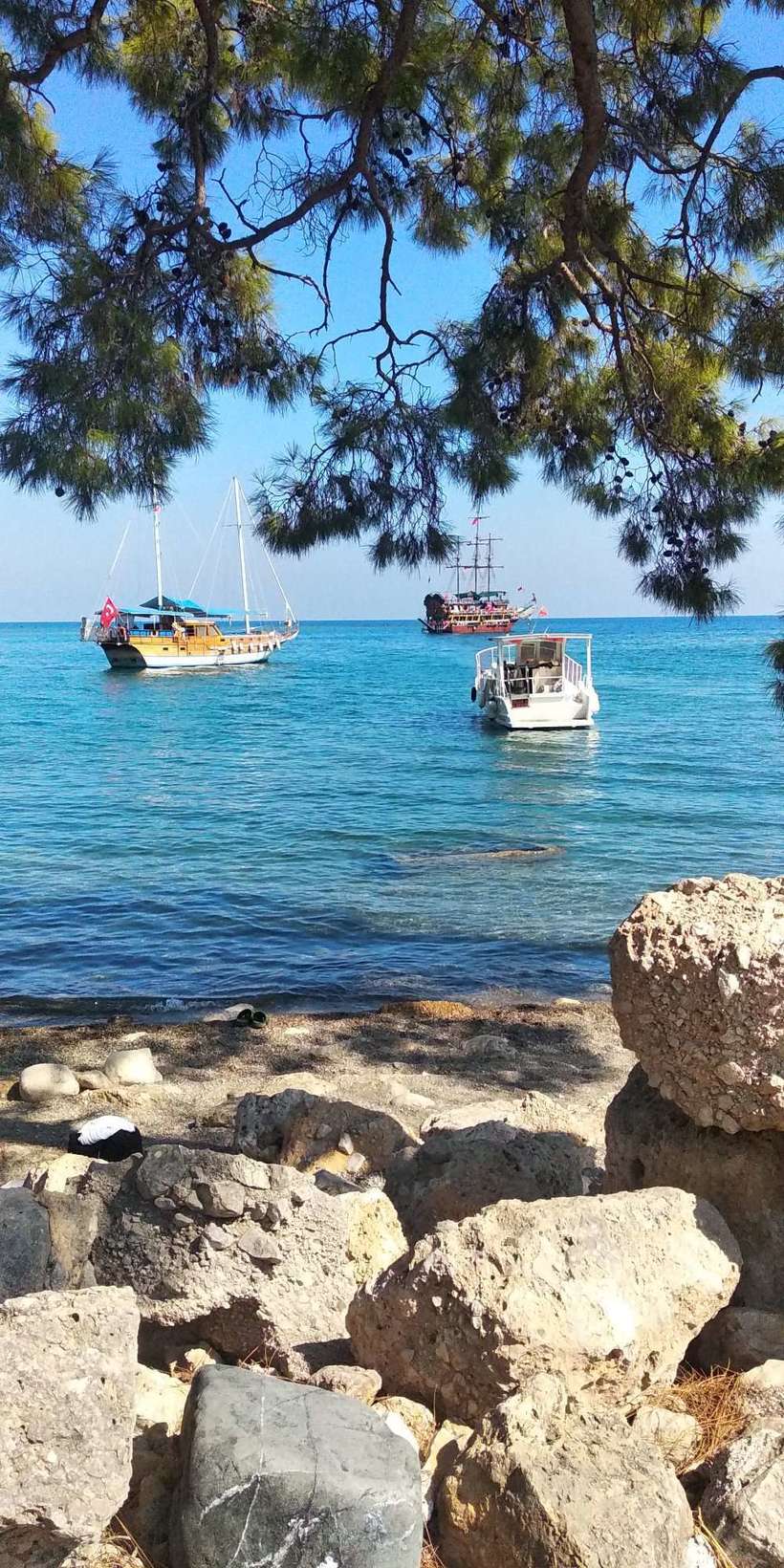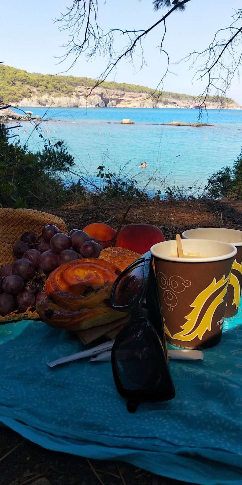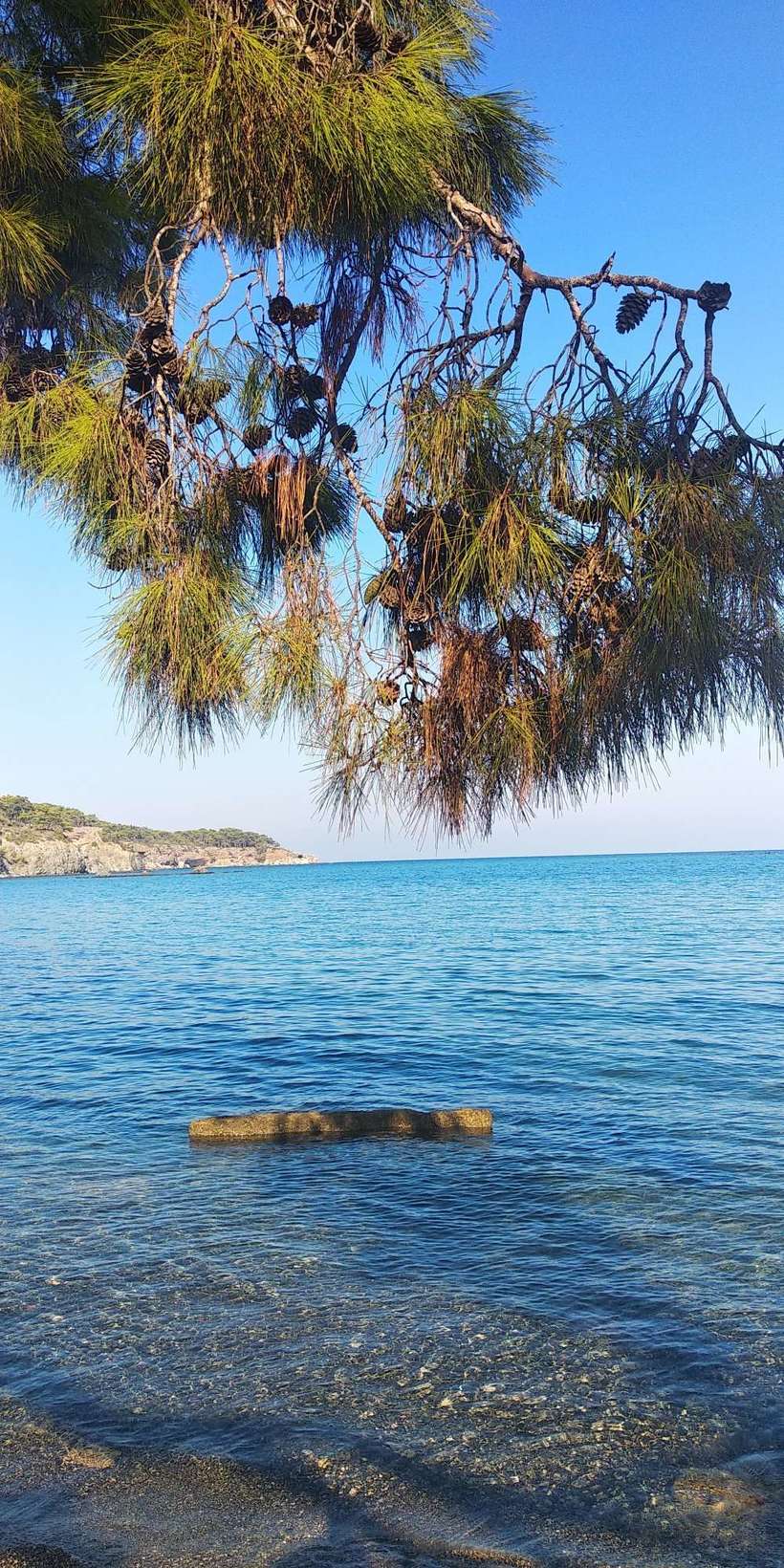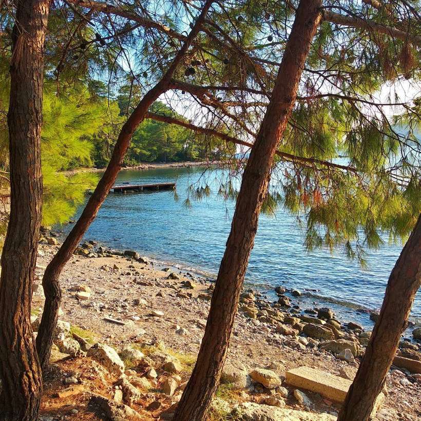 Тут их несколько – две бухточки при входе (обрамленные соснами или кедрами) с галькой и бирюзовой водой. Совсем рядом руины города, лесок. В том же леске в тени можно пообедать на фоне красивых пейзажей.