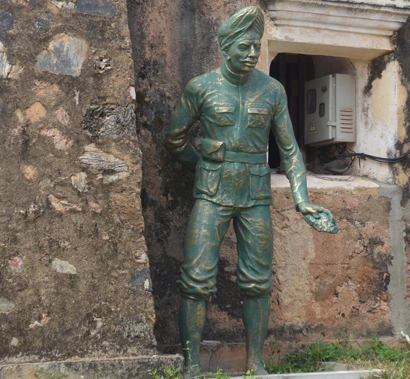 Около подножья башни мы неожиданно встретили несколько фигур. Главными фигурами сценки были военные в старинных мундирах и ланкиец в традиционной одежде. Вояки явно помыкали беднягой, едва-едва тащившим тяжеленный камень. Я сразу подумал, что, наверное, немало простых тружеников легло в землю, прежде чем были построены тот громадный, толстый бастион, на котором мы стояли. У меня сразу упало настроение.