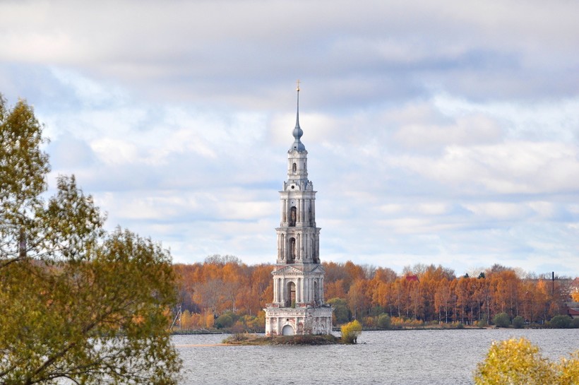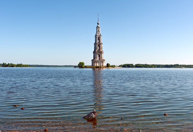 В архитектурном плане колокольня выполнена в стиле классицизм, но куда интереснее не то, какая она, а то, где она находится. А стоит она прямо посреди Угличского водохранилища. Дело в том, что для его создания в советское время пришлось затопить значительную часть исторического центра Калязина. Сам Никольский собор разобрали, а колокольню оставили как маяк.