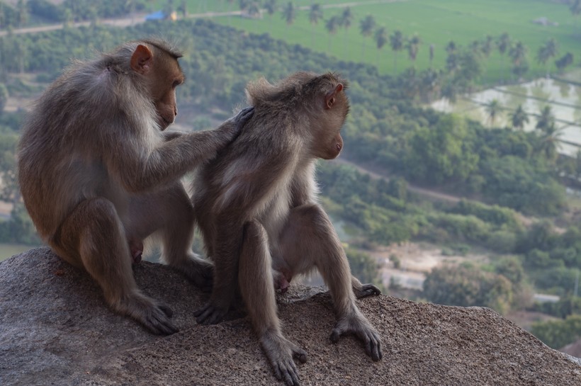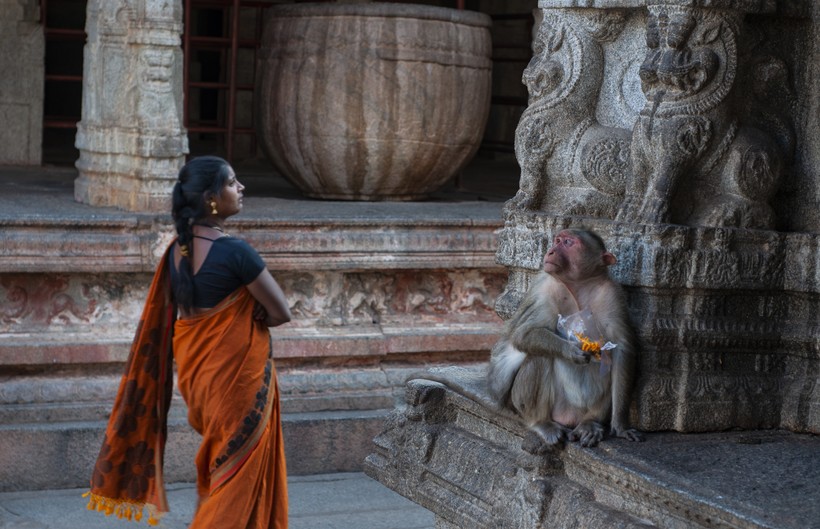 Monkey Temple одна из главных достопримечательностей Хампи. Находится на вершине горы Хануман и привлекает красивым видом на деревню и, конечно же, обезьянами. Каждый день десятки пронырливых обезьянок ждут туристов с угощениями. Они не агрессивные, не пугливые, а избалованные. Привыкли, что каждый человек приносит им бананы и орешки. Поэтому с радостью встречают туристов наверху.