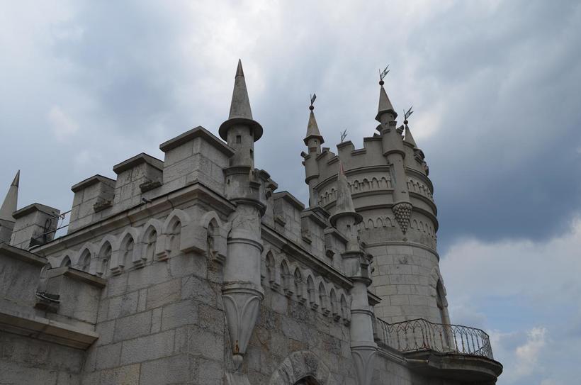 В конце концов, мы выбрались наверх… и были разочарованы. Со смотровых площадок Ласточкино гнездо выглядит значительно более интересно, чем вблизи. Замок ведь совсем маленький, меньше 12 метров в высоту. И рассмотреть его с близкого расстояния сложно, мешают скалы. Те камни, с которых раньше можно было снимать панорамы, сейчас ограждены забором и недоступны.