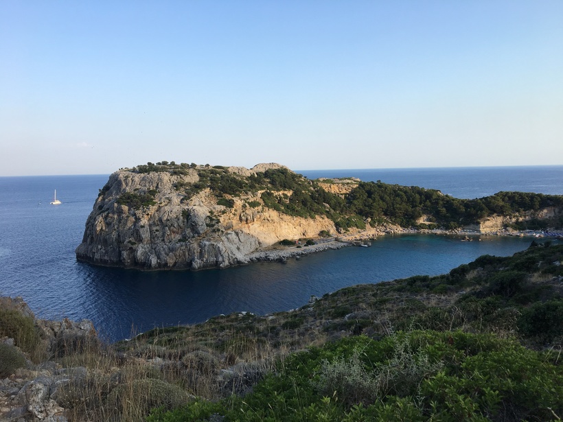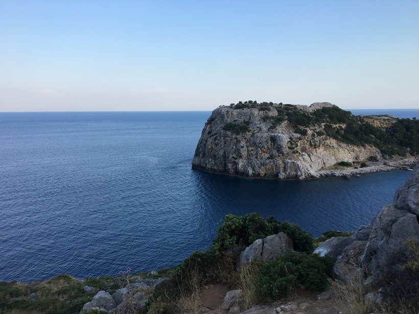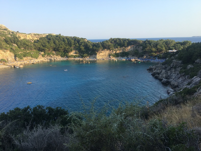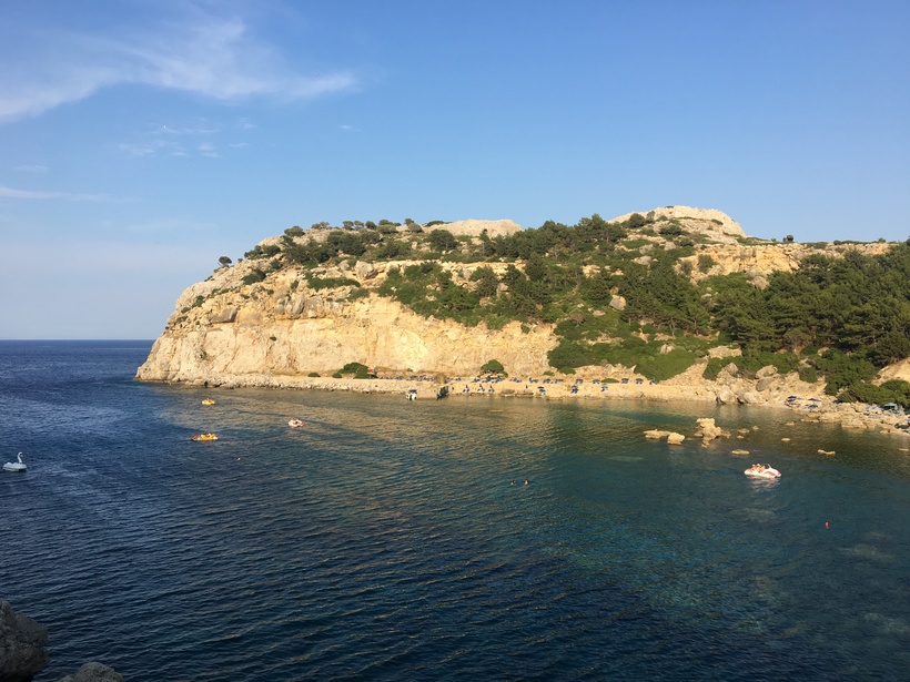 Первой будет бухта Ладико, он не менее красивая и не менее людная, чем Энтони Куинн. Мы посидели там в ресторане, полюбовались видами, а потом обошли всю ее по кругу и пошли в сторону второй. Она находится рядом, в 5 минутах ходьбы.