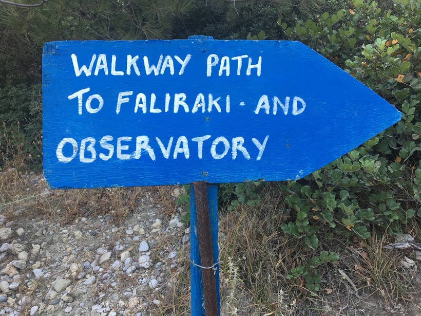 В принципе красиво с любой точки, но, конечно, чем выше, тем лучше. Самые роскошные виды открывались по пути в сторону Фалираки. Дело в том, что, находясь в бухте, мы увидели стрелку, на которой написано: «Тропинка к Обсерватории и Фалираки». Естественно, мы решили узнать, что же это за обсерватория и пошли по ней. Про Обсерваторию я расскажу отдельно. Но вот тропинка эта, дорога, которая, действительно, вывела нас в Фалираки – это место, откуда открываются самые невероятные виды на бухту!