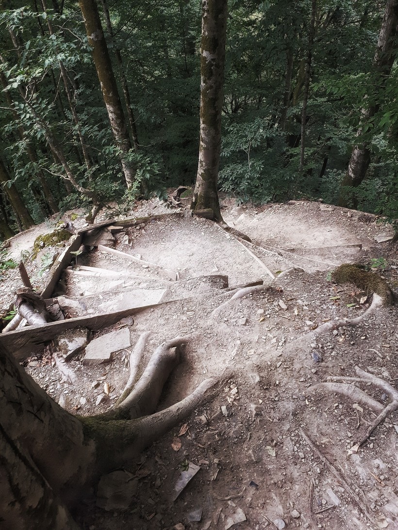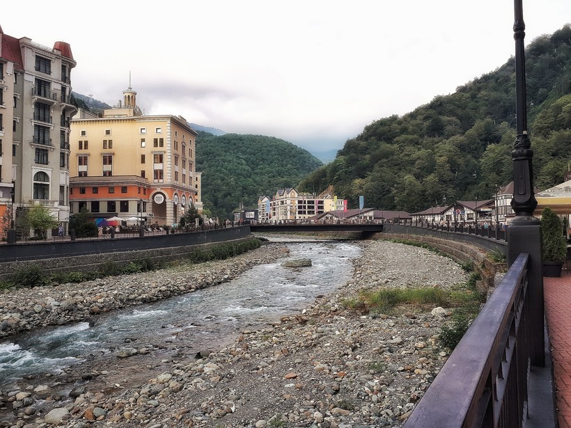 Роза Долина, раскинувшаяся по берегу речки Мзытмы. Здесь есть множество именитых сетевых пятизвездочных отелей, масса ресторанчиков, сувенирных и даже продуктовых магазинов. На этом же уровне есть искусственное горное озерцо и галечный пляж: место для отдыха купания. Здесь же начинается "Тропа здоровья" - один из самых лёгких маршрутов для пеших горных прогулок. Тут надо сказать, что преодоление ее не такое уж и простое: 2-3 км по пересеченной местности. А если взять хороший темп, и гулять так каждое утро, то из отпуска можно вернуться с орехом, как у Ким Кардашьян, хехе. Что отвернуло от Розы Долины, так это проблема с парковкой. То есть, тут есть очень дорогой многоуровневый паркинг, где оставить машину на 3 часа стоит 700 рублей. Можно поездить вдоль горы и попробовать встать на обочине, но, говорят, эвакуаторы в Сочи работают очень хорошо. Мы нашли самый банальный выход: заехали в этнографический музей "Моя Россия" и оставили нашего верного коня там, купив входной билет. Кстати, место замечательное, рекомендую не пожалеть времени на посещение. Подробно о нем расскажу как-нибудь в другой раз.