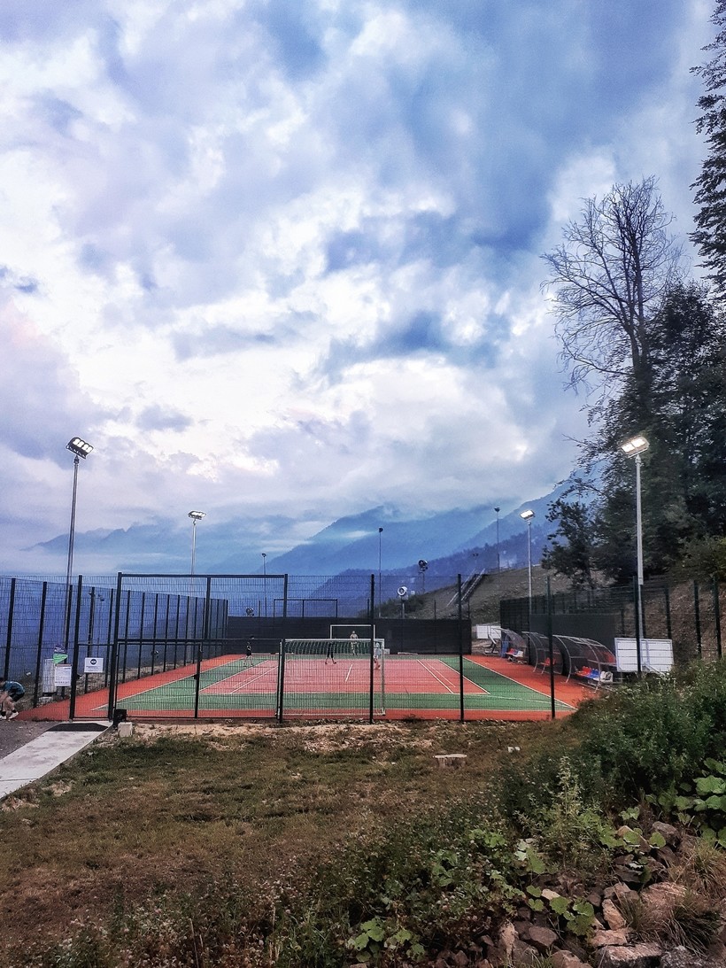 Уровнем выше расположилась Роза Плато, горная Олимпийская деревня. В 2014 году здесь жили спортсмены, соревновавшиеся на лыжных трассах. Сюда можно добраться по канатной дороге, купив билет на подъемник, или на собственном автомобиле. Покрытие трассы замечательное, но серпантин уж очень крутой. На въезде в деревню развернут КПП, где каждую машину проверяют на предмет... не знаю уж, чего именно - оружия, наркотиков?.. Именно сюда привел нас навигатор за Краснополянской косметикой. Тут было небольшое приключение. Мы припарковались прямо возле их фирменного магазина. Выйдя из него, решили погулять, а вернувшись к автомобилю, встретились с охранником, который рассказал нам, что здесь, вообще-то, парковка запрещена. Наш автомобиль внесли в базу, и больше мы на нем на территорию Олимпийской деревни не заедем. Оказывается, в Роза Плато есть отдельные места для гостевых машин. Парковка здесь бесплатная, но ее расположение строго оговорено, и добраться до нее можно по указателями. Нам, на первый раз, простили нарушение. Впоследствии я очень оценила такое устройство: деревня небольшая, передвигаться по ней лучше пешком, и оставить автомобиль под камерой, в охраняемом и, что приятно, бесплатном месте - очень удобно. В Олимпийской деревне много отелей, магазинов, кофеен и развлечений. Вечерами здесь прямо на улице проходят дискотеки, а в определенные дни можно посмотреть кино под открытым небом. На стойках регистрации местных отелей волонтеры и работники предоставляют всю необходимую информацию о работе канатных дорог, экскурсиях, маршрутах... Также здесь продаются билеты на подъемники со скидкой, экономия выходит до 200 рублей. В горной Олимпийской деревне есть своеобразный фитнес-центр со своим тренажерным залом, групповыми тренировками. Можно даже записаться на занятие йогой на воде! Стоимость фиксированная - 500 рублей/урок.