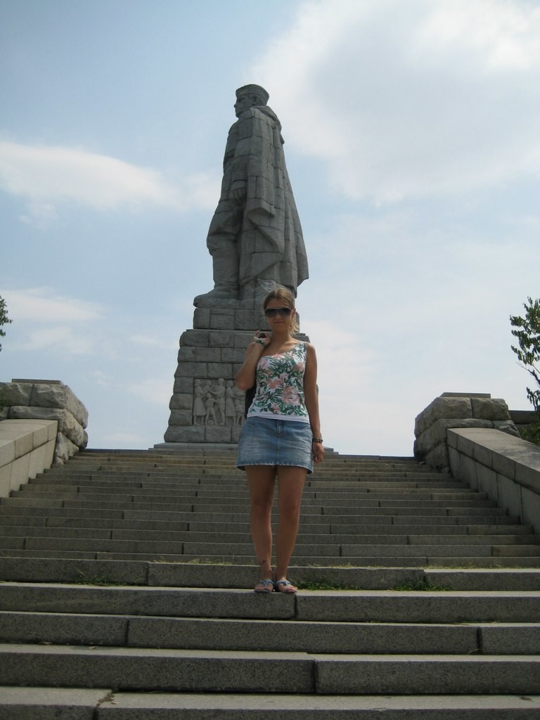 “Ведут к памятнику 100 ступеней”, - оповестил нас гид. Только забыл упомянуть, что ступени начинают считаться с верхней площадки, а для начала надо подняться на саму гору (холм Бунарджик). Не везде там есть ступени, иногда это отшлифованные тысячами ботинок булыжники, по которым страшно подниматься, так как обувь по ним скользит. А спускаться по ним еще страшнее. Некоторые люди из нашей группы остались внизу - у кого больные ноги, у кого давление, так что не каждый в +30 градусов в августе сможет спокойно подобраться к “Алеше”, чтобы полюбоваться вблизи.