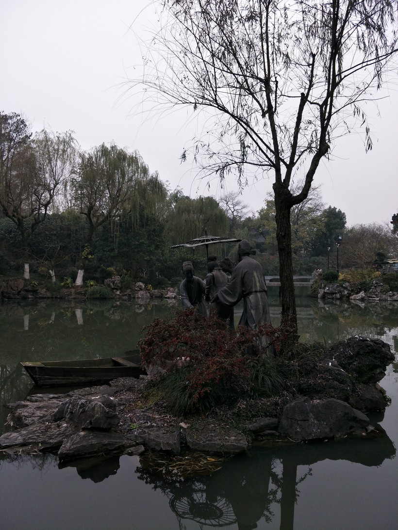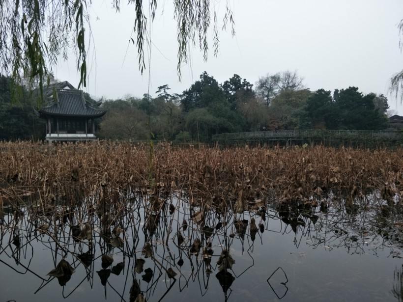 С любой точки береговой линии озера видно остров, к которому постоянно причаливают кораблики. Я не смогла проигнорировать сей факт и оказалась на острове Три бассейна отражающих луну (Three pools mirroring the moon). Остров очень необычен - состоит из прудов, покрытых лотосами и кувшинками. Узкие дамбы отделяют пруды друг от друга и от остального озера. К сожалению, в декабре я увидела лишь засохшие листья цветов, но даже в таком унылом виде было интересно прогуляться по этому острову.