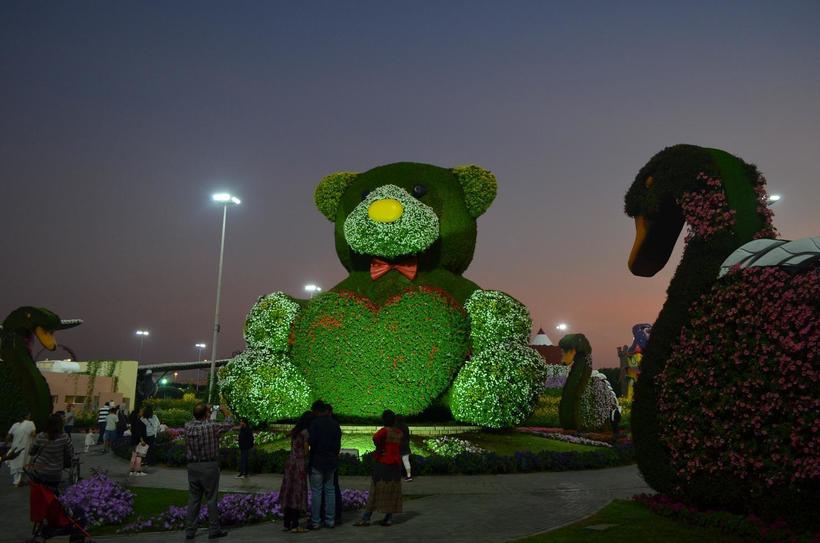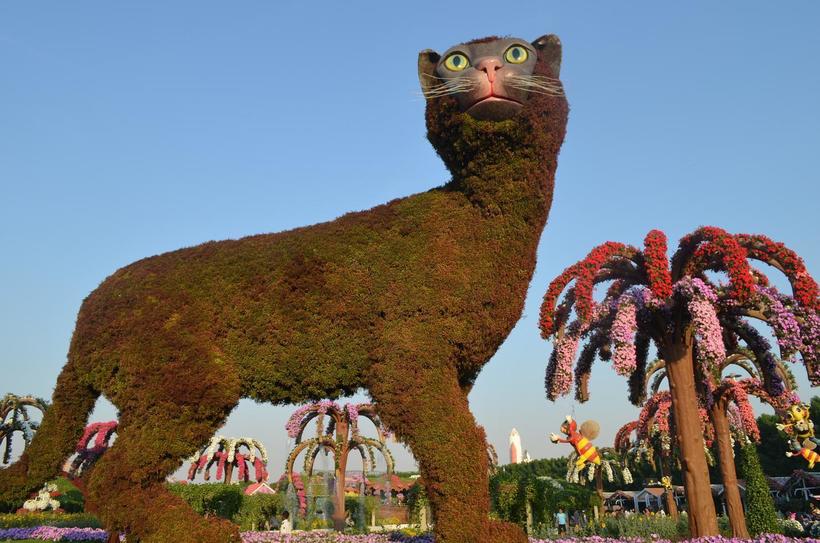 Я видел много разных парков, но такого не встречал. Топиарное искусство, мастера которого создают из кустарников разные фигуры, распространено по миру. Например, увитые цветами арки и фигурки из зелени легко отыскать в центре Москвы. Но в Дубае создана настоящая фантастика. Как только мы зашли, сразу остолбенели, увидев несколько котов высотой с многоэтажку. Только морды у зверюг были пластмассовые, все остальное туловище составляли зеленые насаждения. Рядом стояли огромные слоны.