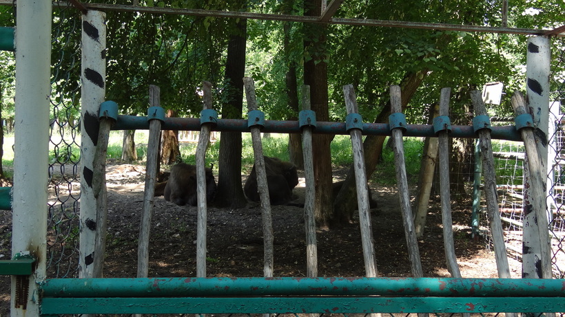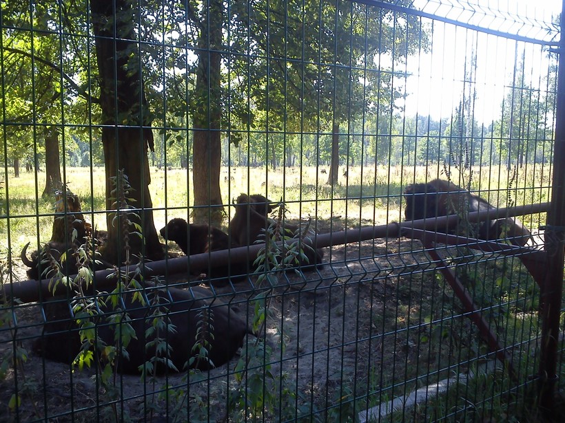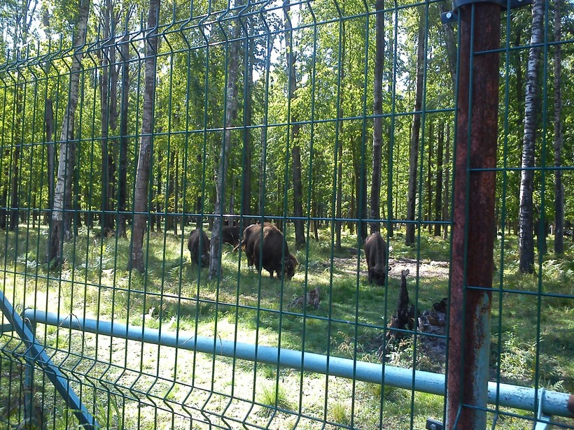 Почему есть возможность? Да потому, что территория обитания этих животных огромна – и они могут не выйти к ограждению вдоль экскурсионной тропы, чтоб себя показать. Но не волнуйтесь, даже если вам не повезет увидеть зубров, разгуливающих по лесу, то по мере прохождения отведенного для туристов расстояния вы все равно этих животных увидите))) Есть небольшой загон где всегда присутствует зубр, а по соседству с ним североамериканский бизон. Они, бизоны, тут тоже есть, немного. Несколько особей . Вот эти животные (зубры в загоне) отдуваются за всех остальных зубров, если вдруг туристы их не увидят))). Немного не справедливо конечно, но зато гарантия для всех, кто приехал посмотреть на этих чудесных животных. Помимо зубров и бизонов здесь есть лесные олени. Они очень пугливы, и чтоб совсем в чащу леса они не убегали, их место обитания огорожено сеткой. Это касается тех оленей, которые также отдуваются за других своих сородичей))).
