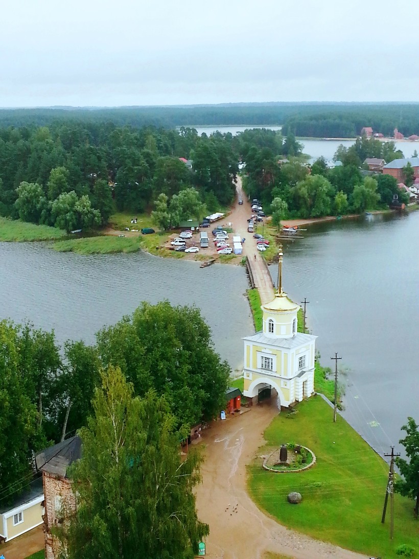 Монастырь находится примерно в 25 километрах от города Осташков. Дорога до монастыря довольно-таки неплохая, в отличии от дорог в самом Осташкове. Изначально у нас была идея доплыть до монастыря на теплоходе, который отходит от пристани в Осташкове. Но с погодой нам опять не повезло, накрапывал дождь, местами переходящий в ливень и рейсы теплохода, к сожалению, в эти дни отменили. Поэтому мы отправились в монастырь на машине. Парковка находится перед мостом, который соединяет остров с большой землей. Хотя шел дождь, машин на парковке было немало. Около парковки продавали различные сувениры и дождевики. Оставив машину на парковке мы отправились в монастырь.