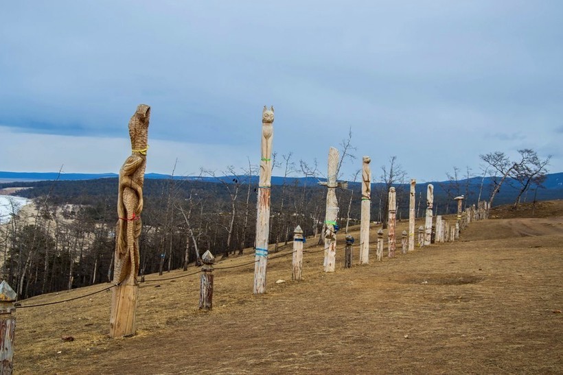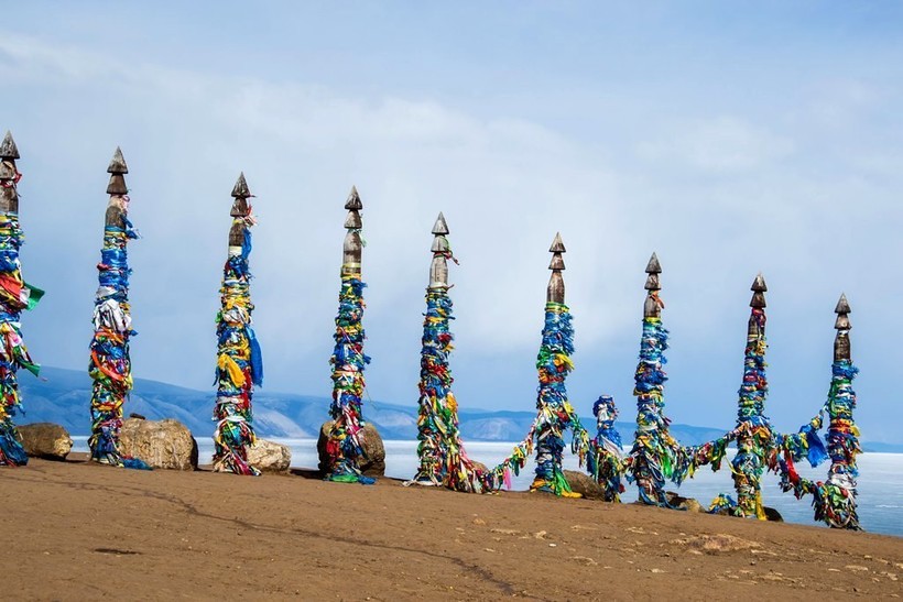 Еще только изучая информацию об Ольхоне и Хужире, я обратила особое внимание на эти столбы – настолько ярко, притягательно и интересно они выглядели. Я решила, что их нужно увидеть в обязательном порядке. Вот и сейчас, стоя перед ними, мое мнение не изменилось. Тринадцать нарядных высоких столбов первыми встречают тебя в этом древнем священном месте. Одна бабушка-шаманка, которая повстречалась мне в поселке, рассказала, что если прийти сюда одному и налить молока у основания одного из столбов, который больше всех приглянется, то можно просить у духа Байкала исполнить твое самое заветное желание.