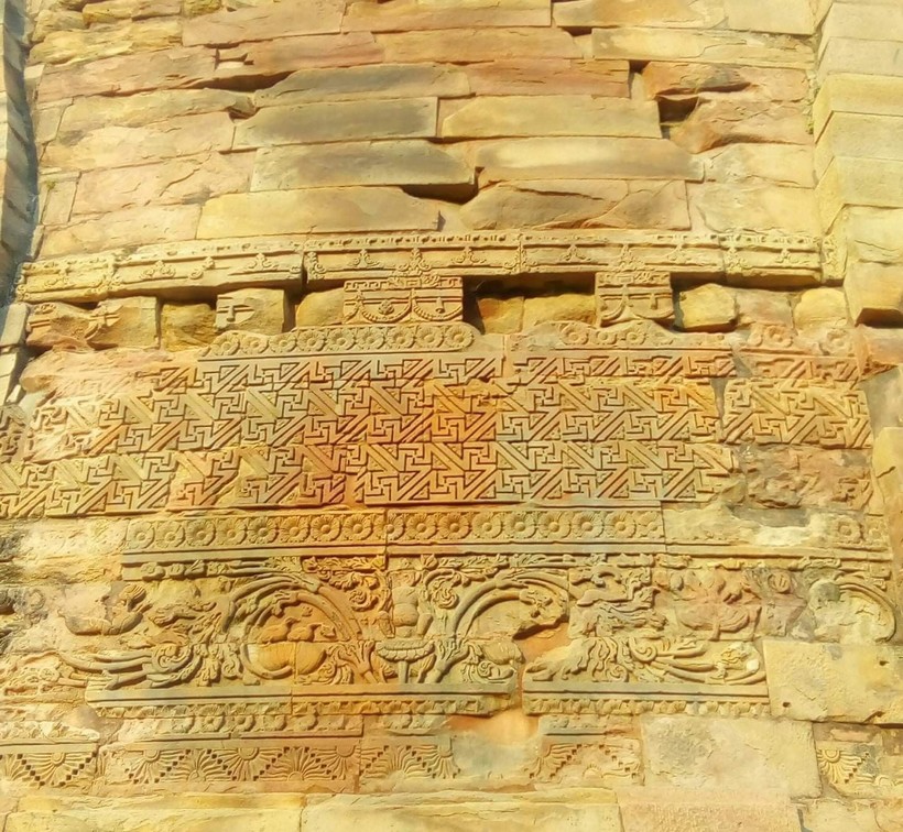 Сама ступа Дхамех представляет собой цилиндрическую башню, сделанную из кирпича. Она довольно высокая- в 43 метра высотой. Диаметр тоже впечатляет- 28 метров, попробуйте обойдите такую махину. К стенам ступы индийцы приклеивают кусочки золотой фольги, наверно так они хотят выразить почтение и украсить сооружение. В основании ступы, которое шире, чем верхняя часть, имеются ниши по форме окошек. Я заметила в основании башни и геометрические узоры и растительные орнаменты времен династии Гупта, выбитые в камне, они довольно хорошо сохранились, учитывая, что ступу построили в 6 веке нашей эры. Кстати, на месте этой ступы говорят раньше были какие-то другие древние постройки. К ступе ведут дорожки, а вокруг газоны с зеленой травкой.