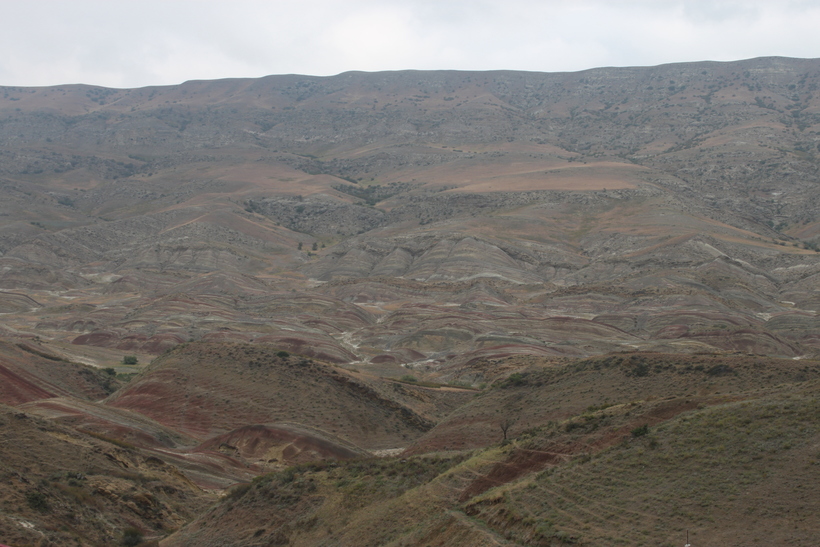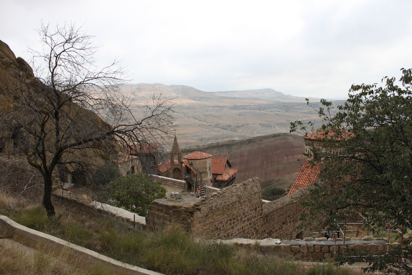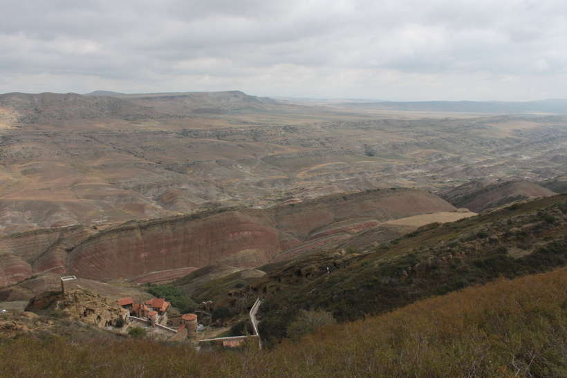 Прежде всего, в монастыре встречает вот такая инопланетная панорама. Разноцветные слои минералов выглядывают со склонов холмов повсюду. По-моему, это круче всяких там Перу и парков Данься, ведь это так близко! Знакомьтесь, Давидо-Гареджийское нагорье, и теперь оно будет с нами по всей территории монастыря.