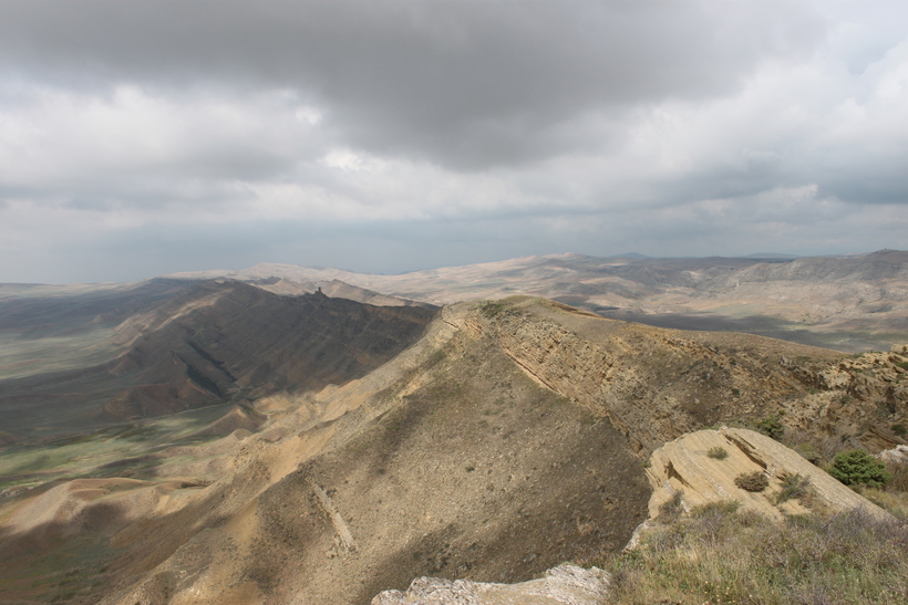 Далее тропа ведет на другую сторону хребта, еще ближе к границе с Азербайджаном. Здесь уже даже на телефон пришла смска с «Добро пожаловать», а старые металлические пограничные столбики навевали тревогу. Но граница проходит теперь ниже по холму, ее кстати, можно разглядеть, и переживать не о чем. С вершины хребта открывается почти толкиеновский вид…