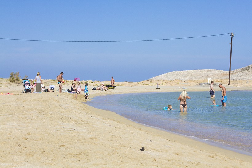 Во-первых, сам пляж закрыт от моря дамбой, поэтому волн в нем практически нет. Вода чистая, гладкая, на ней еле заметно покачиваются разноцветные лодки. Здесь чистый мелкий золотистый песок, никаких камней, дно песчаное и заход плавный. Сочетание воды и песка почему-то напомнило мне Доминикану (и да простят мне крамолу – в Греции лучше).