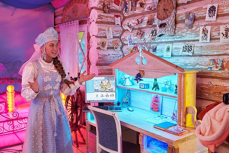 Снегурочка встречает с хлебом-солью и приглашает пройти в свой прекрасный терем. Там детей и взрослых ждет театрализованное представление, в котором, помимо Снегурочки, участвуют кот Баюн и парочка домовых.