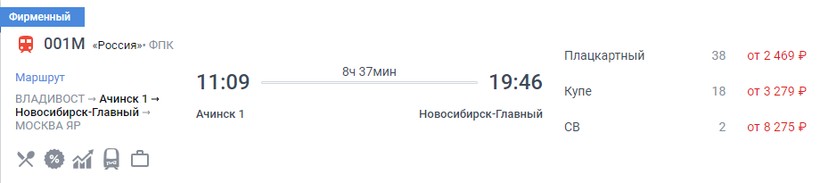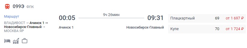 В зависимости от месяца, минимальная стоимость билета на поезд Ачинск (Россия) — Новосибирск (Россия) колеблется от 913 (ноябрь, поезд 081И) до 1 552 рубля (май), а в среднем купить билет можно за 1240 — 1 338 рублей.