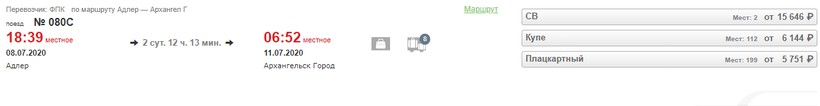 На октябрь-ноябрь минимальная стоимость билета в Архангельск составляет 3044 (поезд 080С, Плацкарт), а максимальная — 22520 (поезд 080С, Люкс).