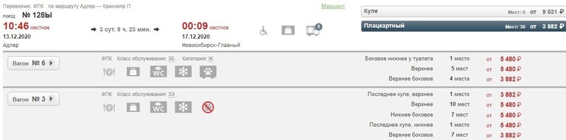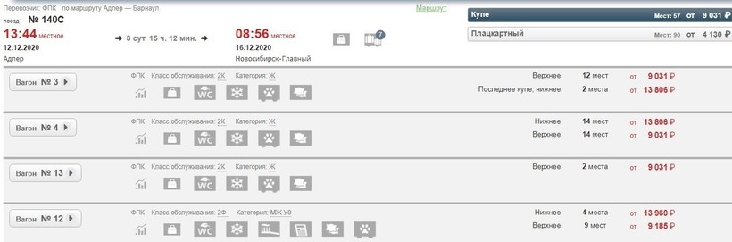 На октябрь-ноябрь минимальная стоимость билета в Новосибирск составляет 3617 (поезд 128Ы, Плацкарт), а максимальная — 12093 (поезд 128Ы, Купе).