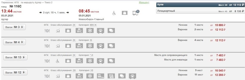 В зависимости от месяца, минимальная стоимость билета на поезд Адлер (Россия) — Новосибирск (Россия) колеблется от 3617 (ноябрь, поезд 128Ы) до 8 594 рубля (июнь), а в среднем купить билет можно за 4574 — 6 461 рубль.