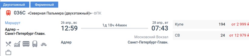 Для длительных путешествий я стараюсь выбирать фирменные поезда, чтобы получить максимальный комфорт от поездки. Из Адлера в Санкт-Петербург ежедневно круглый год ходит фирменный состав «Северная Пальмира (двухэтажный)». Расписание движения меняется в зависимости от сезона (актуальное стоит смотреть перед поездкой). До конца апреля состав отправляется в 12:59, прибывает в 07:43. Продолжительность путешествия составит 1 день 19 часов. Далее выезд происходит в 17:41, приезд не меняется — в 07:43, в пути нужно провести на 5 часов меньше.