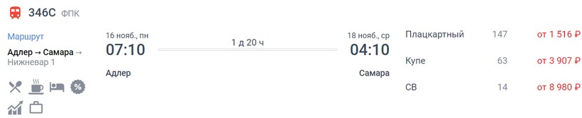 На октябрь-ноябрь минимальная стоимость билета в Самару составляет 1742 (поезд 346С, Плацкарт), а максимальная — 14816 (поезд 408С, Люкс).