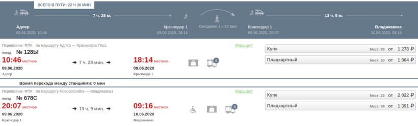 В качестве альтернативы предлагаю вариант с пересадкой в Краснодаре. По времени выйдет дольше, чем на прямом поезде — 22 часа 30 минут. Выезд из Адлера (в 10:46) на поезде № 128Ы (курсирует с конца мая до начала ноября по вторникам, воскресеньям, далее — еще и по четвергам). По такому же графику по понедельникам, средам, пятницам ходит состав № 344C. Прибытие запланировано через 7 часов 28 минут — в 18:14. Пересадка занимает 1 час 53 минуты. Отправление из Краснодара (в 20:07) на поезде № 678С (курсирует 1–2 раза в неделю), приезд через 13 часов 9 минут — в 09:16. Сервис в поездах хороший. Вагоны оборудованы разными мелочами для комфортной поездки — установлены биотуалеты, в летний период работают кондиционеры, зимой включают систему отопления. Поездная бригада профессионально выполняет свои обязанности, вежливо относится к пассажирам. В поездах есть багажное купе, можно сдавать габаритные чемоданы, сумки (оплата за услугу осуществляется сразу при покупке билета). Постельное белье выдается в индивидуальных упаковках. Матрасы, подушки без пятен, пыли.