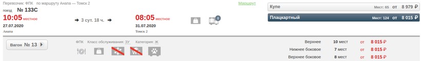 Актуальные цены и расписание поезда Анапа — Томск, стоимость и информация о наличии билетов на скорые поезда АО «ФПК».