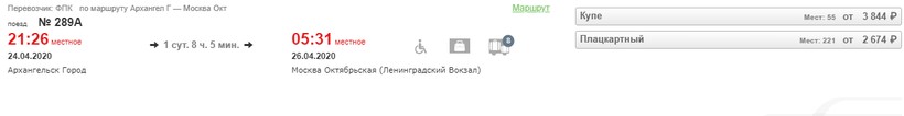 № 289А. Отправление — 21:26, прибытие на Ленинградский вокзал — 05:31. Время в пути — 1 сут. 8 ч. 5 мин. Курсирует с июля по август по четным числам, в апреле и мае — в определенные дни (рекомендую дополнительно уточнять расписание при планировании поездки в эти месяцы).
