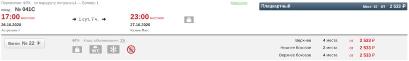 На октябрь-ноябрь минимальная стоимость билета в Казань составляет 1725 (поезд 041С, Плацкарт), а максимальная — 6521 (поезд 041С, Купе).