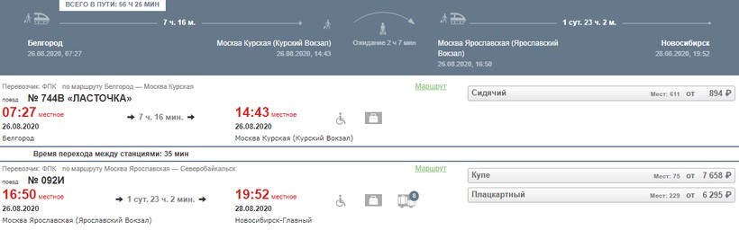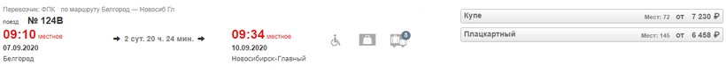 В зависимости от месяца, минимальная стоимость билета на поезд Белгород (Россия) — Новосибирск (Россия) колеблется от 3923 (ноябрь, поезд 124В) до 12 771 рубль (август), а в среднем купить билет можно за 4198 — 5 662 рубля.
